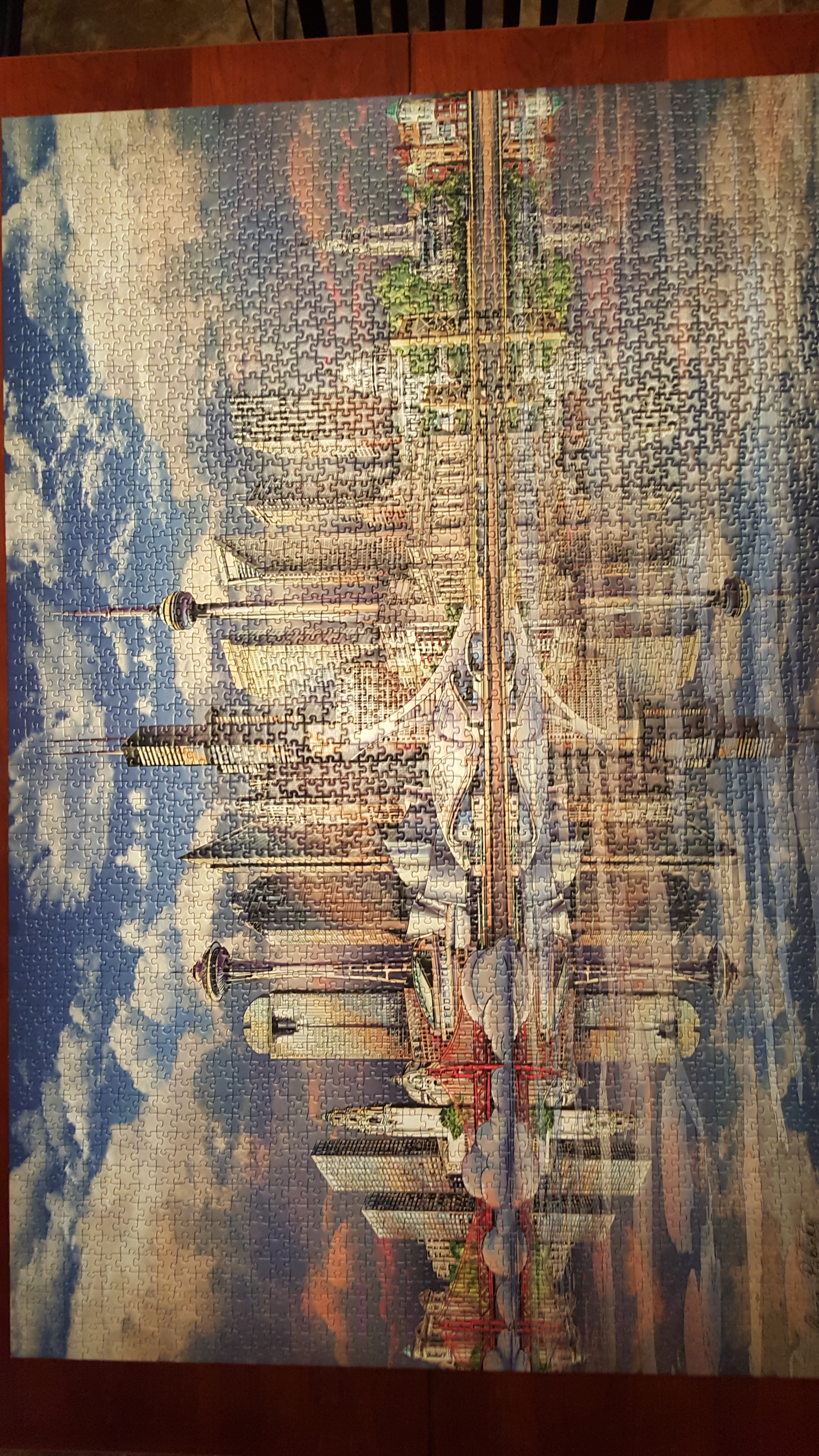 I purchased the Ravensburger North American Skyline puzzle to put together, with my husband, over the Fourth of July weekend.  I selected the puzzle because the picture was beautiful and it had 3000 pieces.  Most of the puzzles I could purchase locally only went up to 1000 pieces and those would have been done in a few hours.  I was looking forward to this puzzle adventure, because we hadn’t put a puzzle together in at least a decade.
