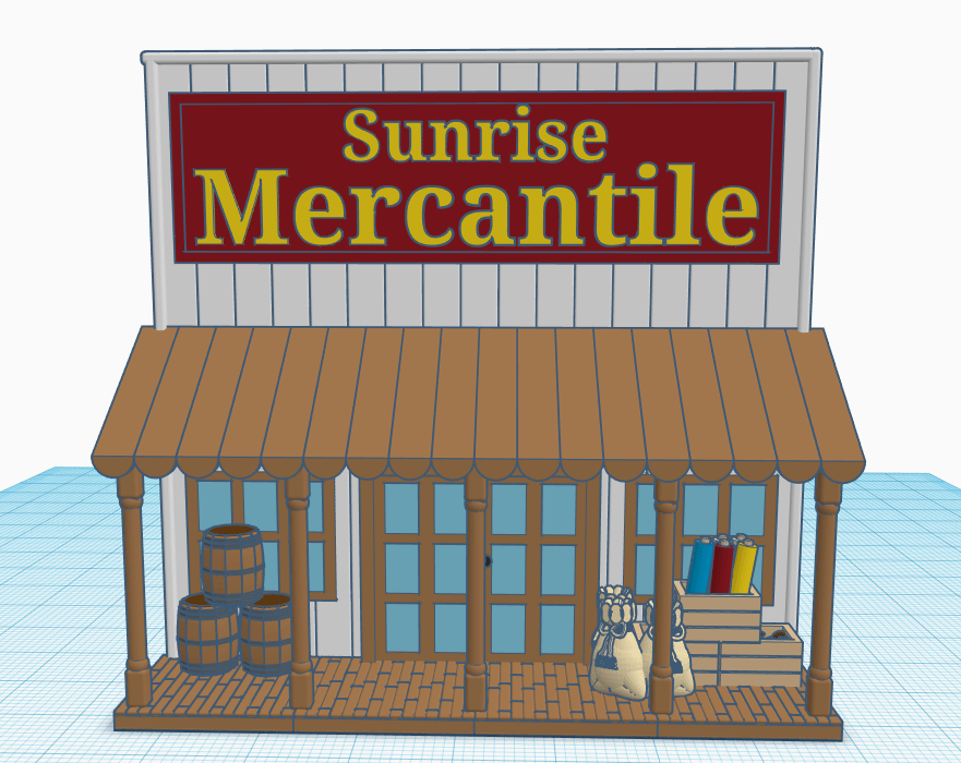 Many years ago I created a 3d train in Tinkercad. My goal was to create all the buildings I needed for a Railroad town. (Yes, I am slow featuring the buildings here.) My Railroad Town, which I named Sunrise, has a Train Station, Saloon, Bank and other buildings. The citizens of this town would need a place to buy and sell goods; the Railroad Town Mercantile was created. Yes, I could have name in General Store, but I wanted a more sophisticated name.