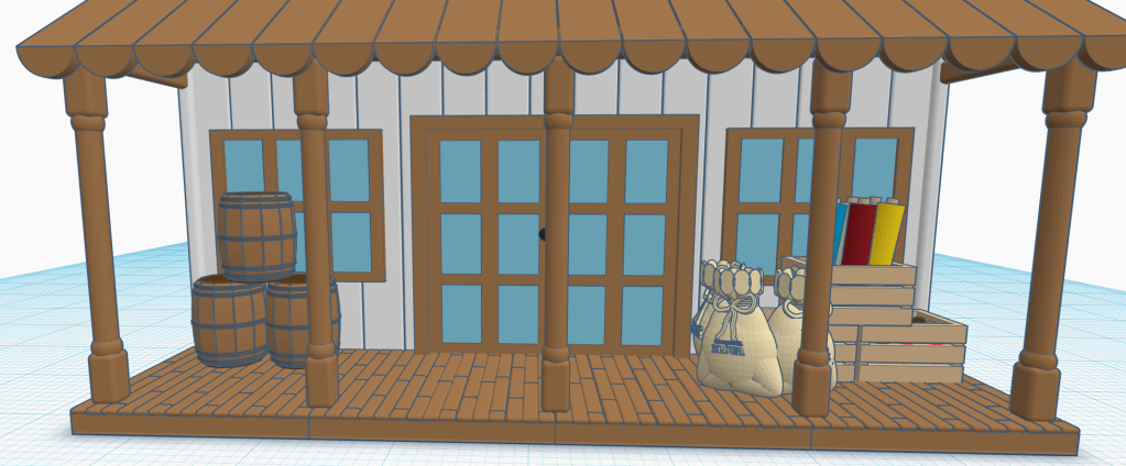 I have created buildings for my Railroad Town using Tinkercad. The last building I created was the town’s mercantile. If you look at the front of the building, you will notice that I created some bags of flour along with other supplies.