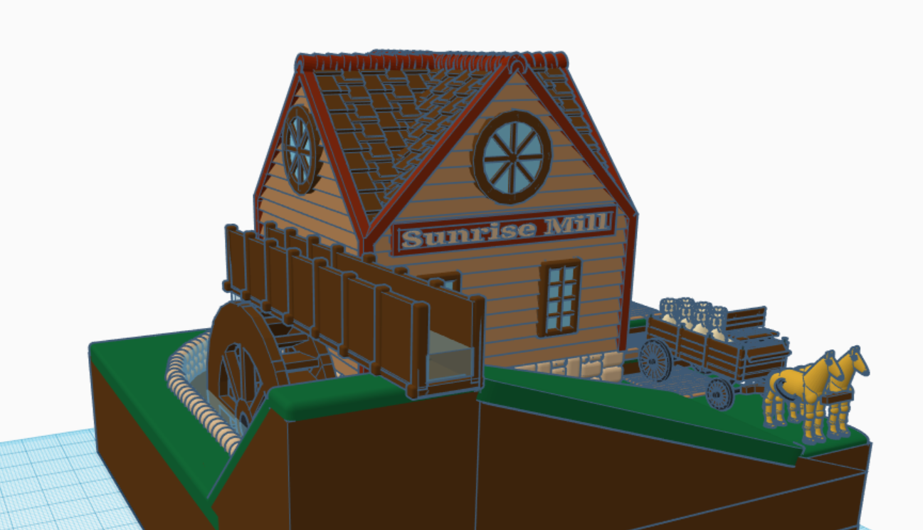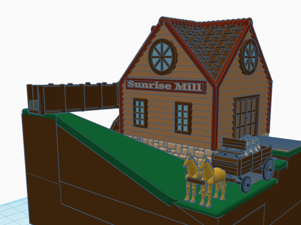 I copied my horses and wagon from the Tinkercad design I made for the Town Livery and loaded the wagon with copies of the flour from the town’s Mercantile design file. I just noticed the horses do not have their harness on, let me go correct that.