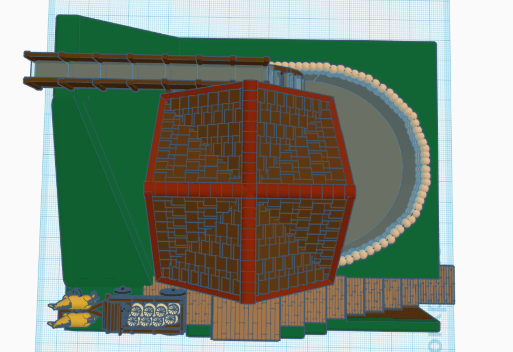 First I created the water wheel, which match the gears on the inside. Then I created the building. I needed a trough to direct water on to the water wheel.