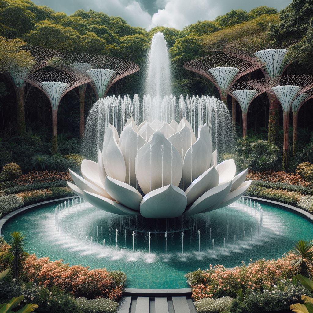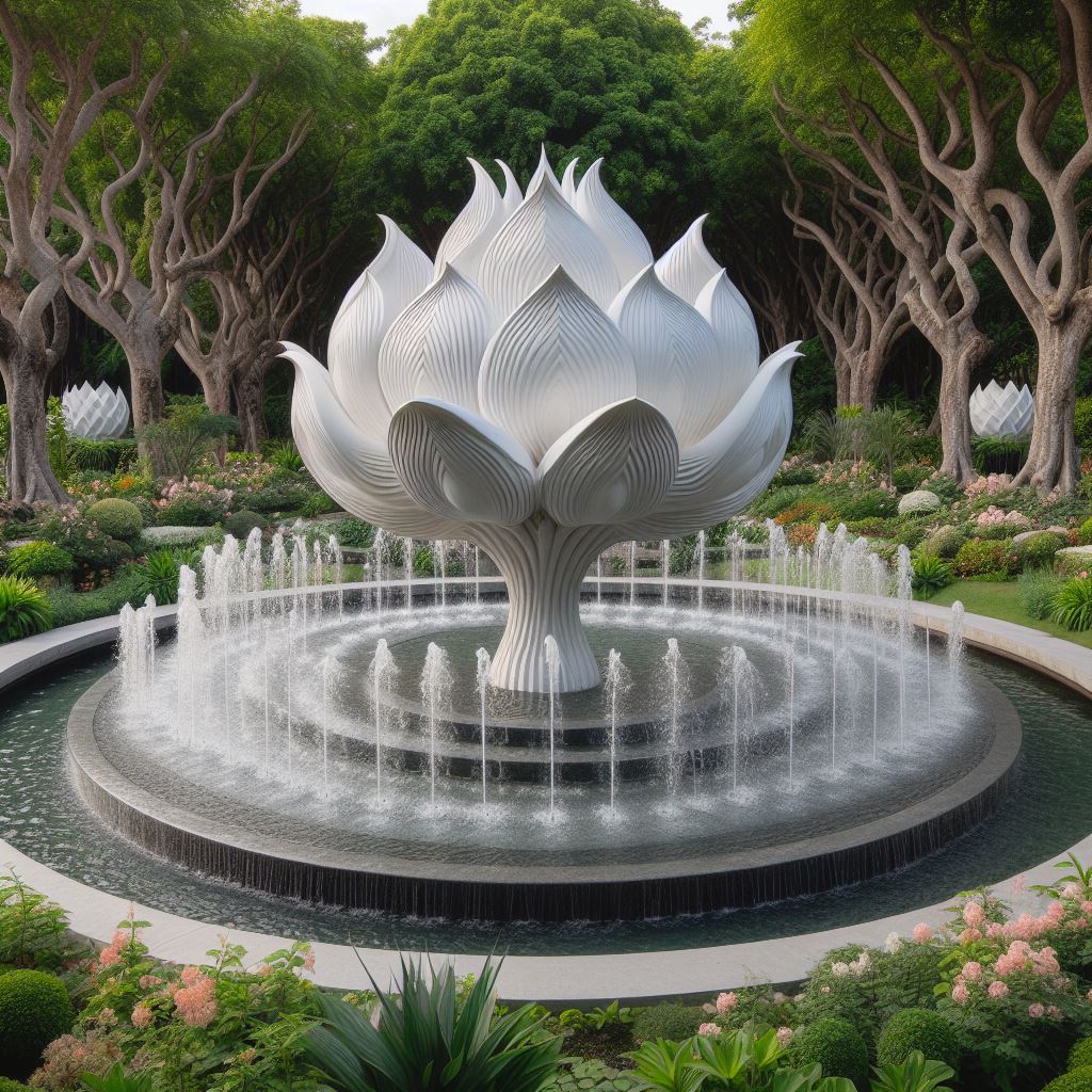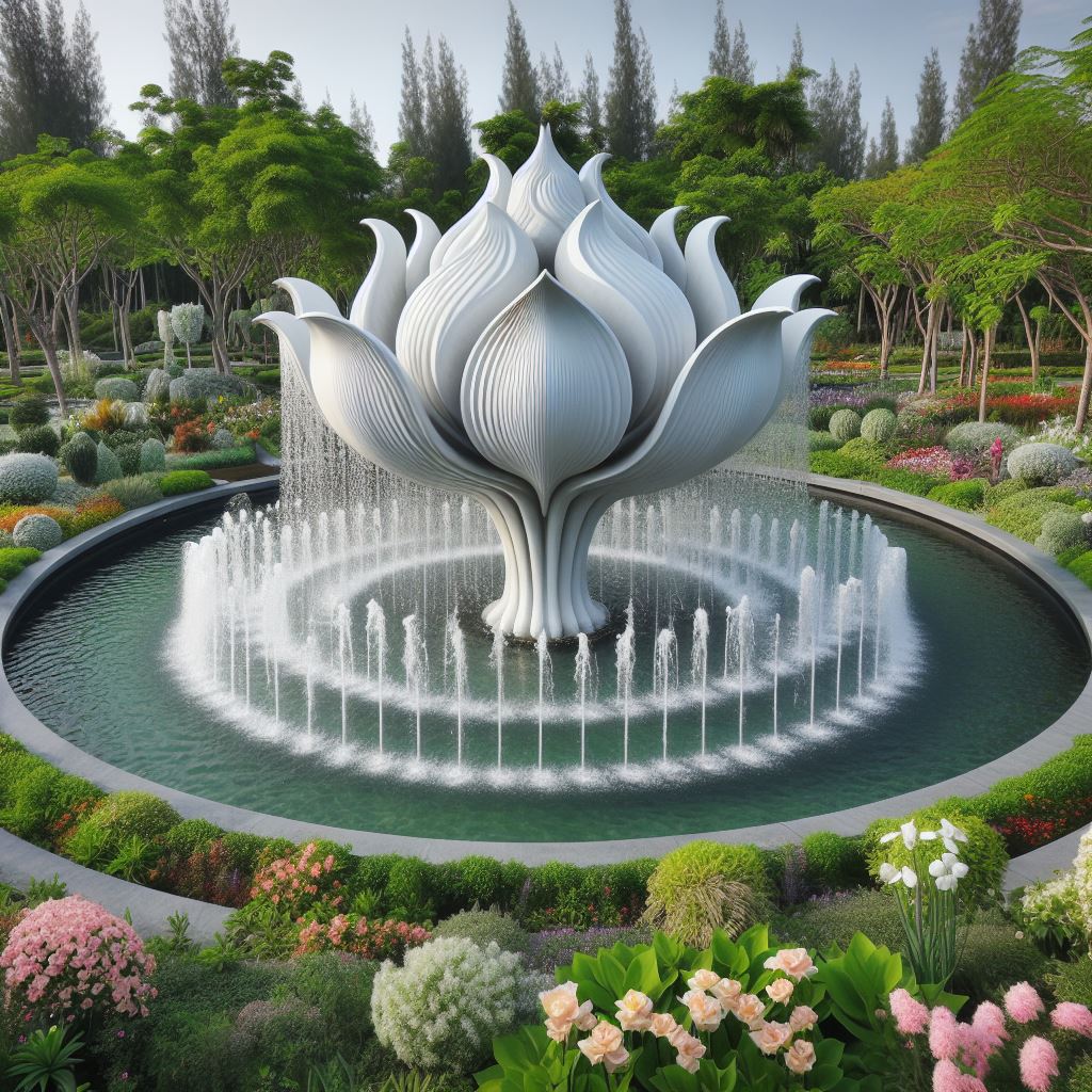 Description: The garden with variety of trees and flowers. The garden features a fountain sculpted from white marble, resembling an open flower. Within the fountain, 40 water sprouts shoot up into the air, cascading back down like rain into the crystal-clear pool.