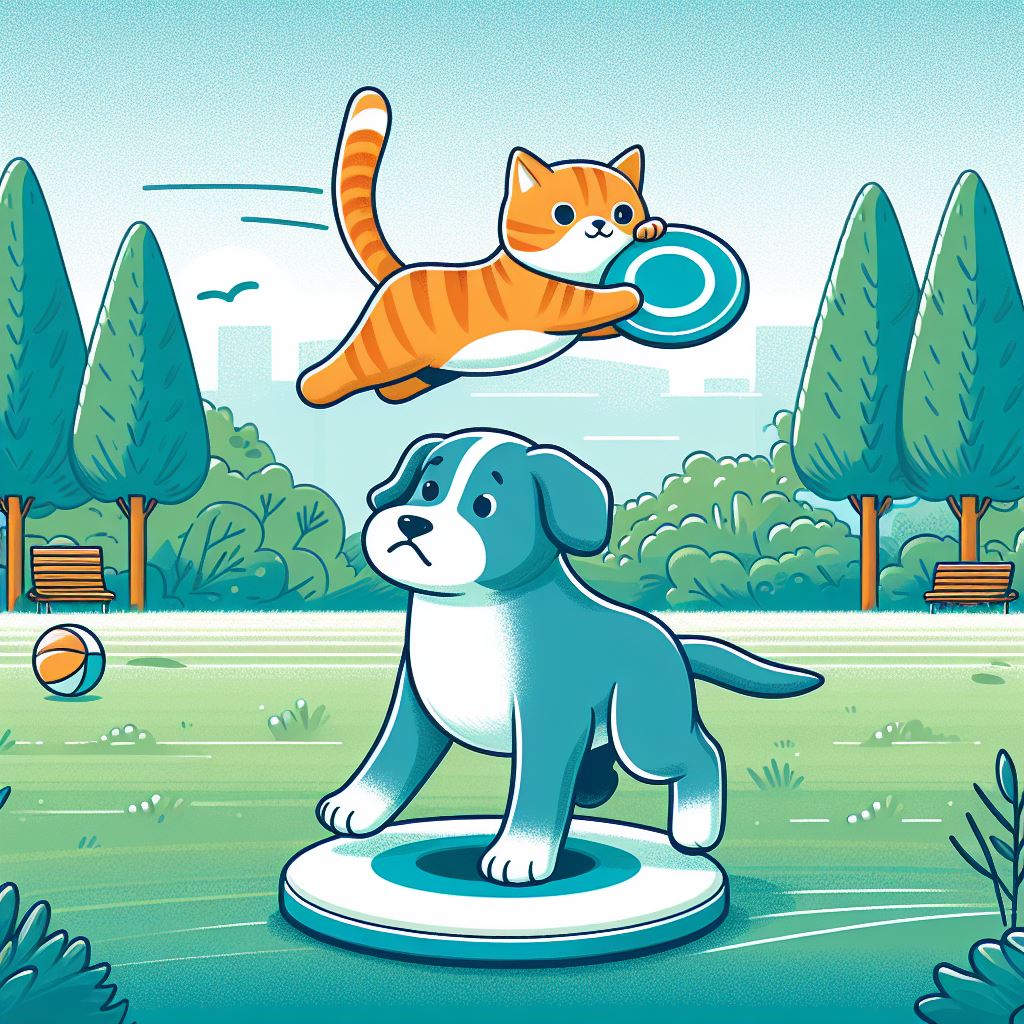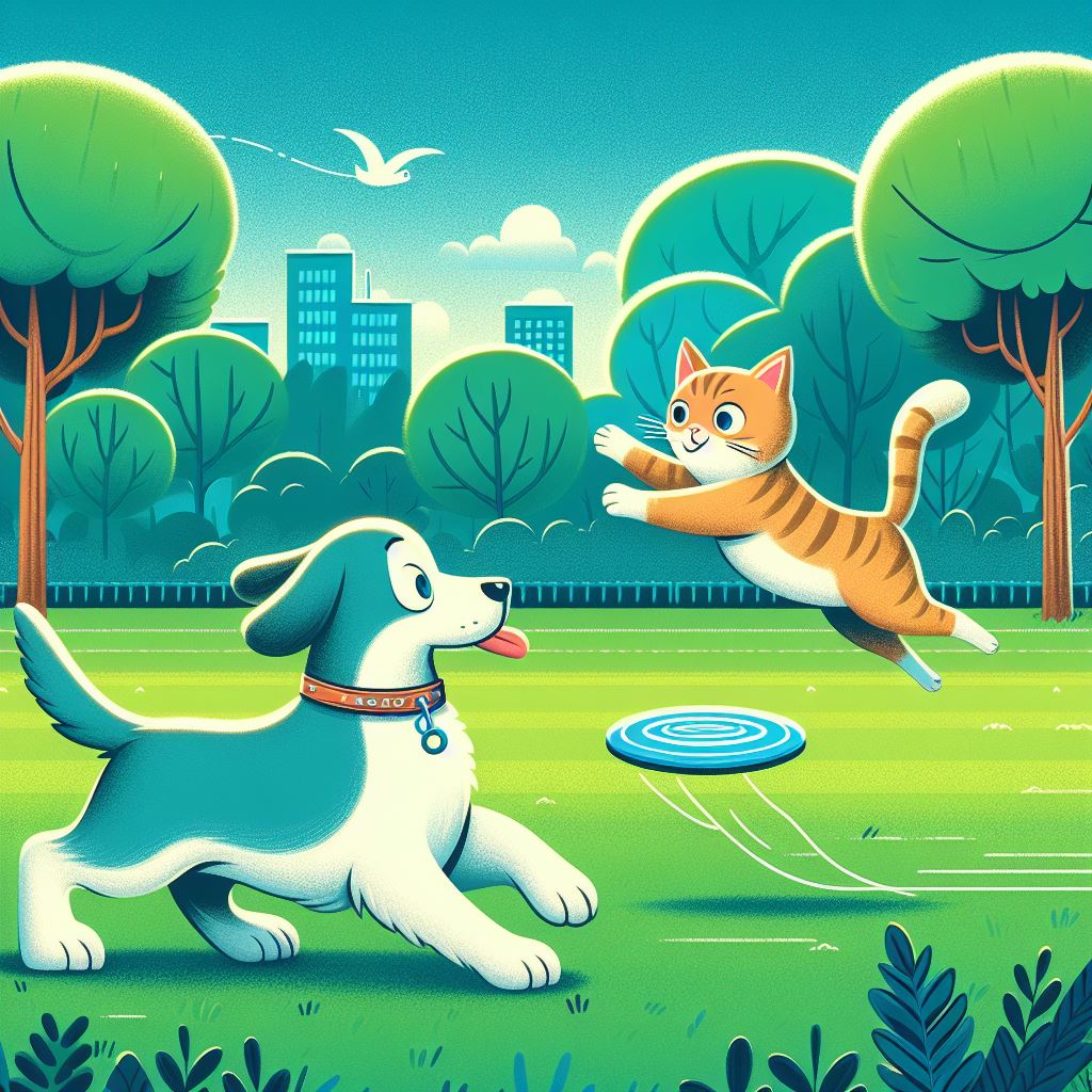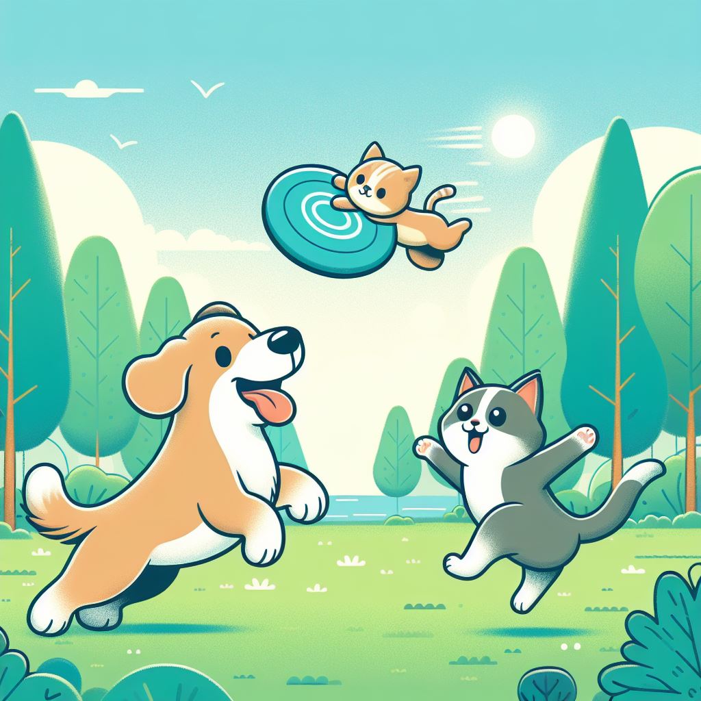 Description: A dog playing frisbee and cat riding on the frisbee. They are in a park which has a bluish green field surrounded by a variety of trees.