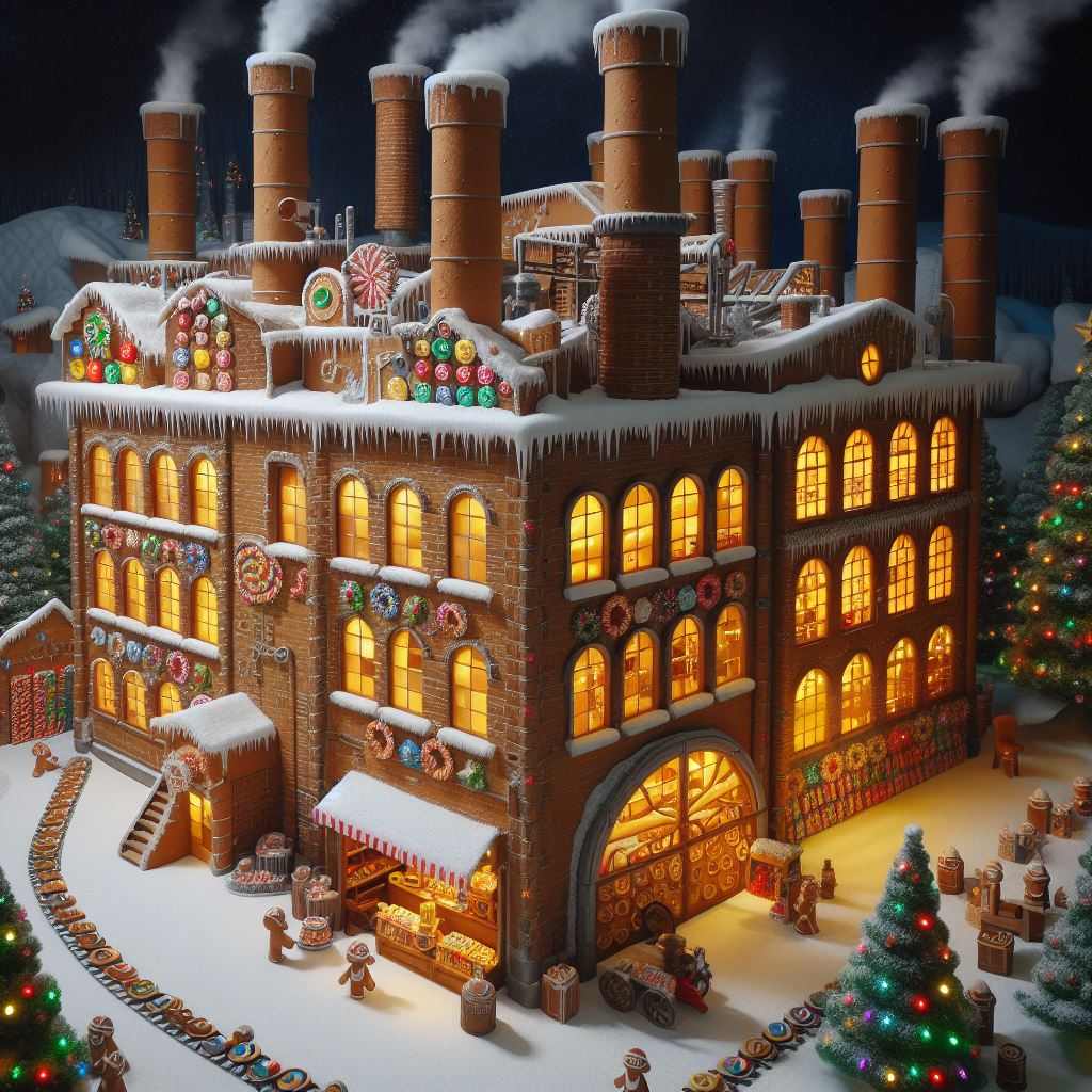 One prompt I used was: “candy manufacturing plant made of gingerbread located in the north pole that is run by Santa’s elves”. Below are the images the AI returned.