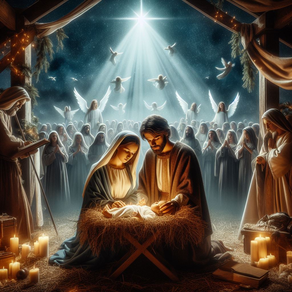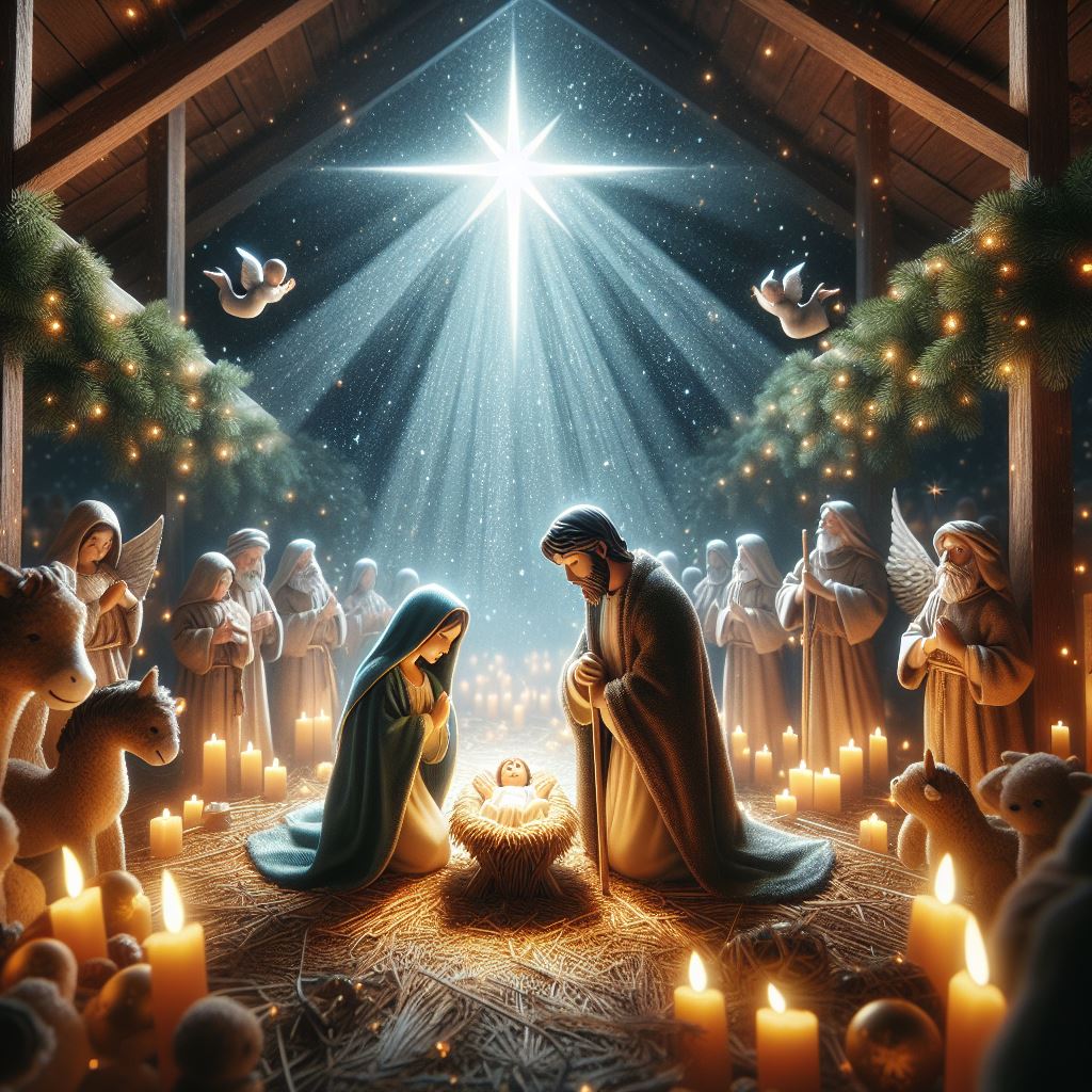 Description: a nativity scene with Mary, Joseph, and baby Jesus in a manger with the Bethlehem Star shining down on the stable. In the background show choir of angels in the background.
