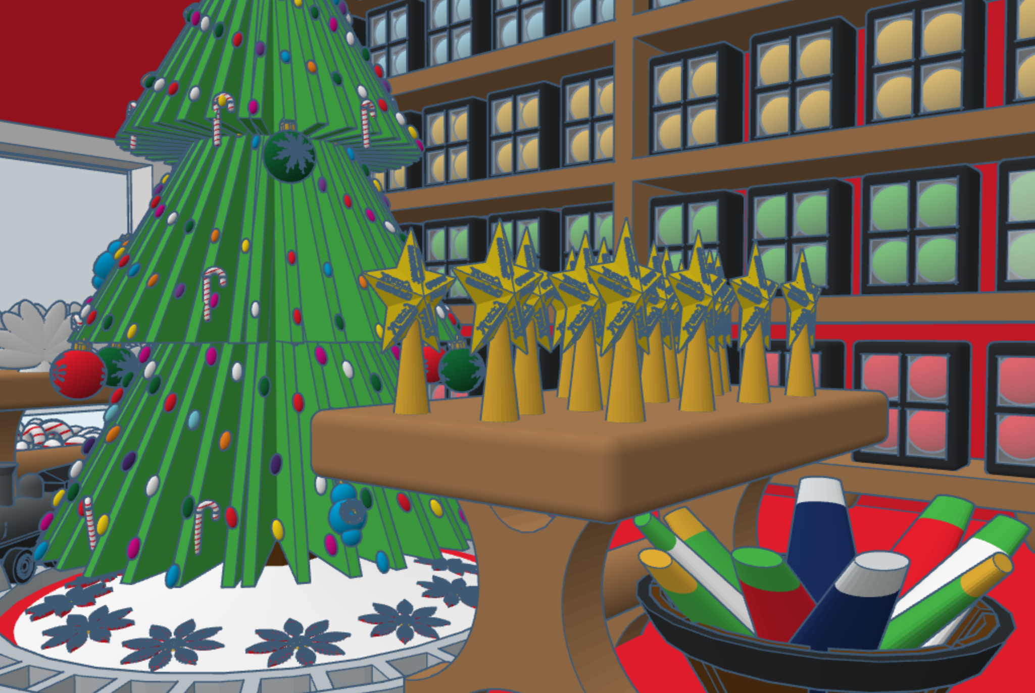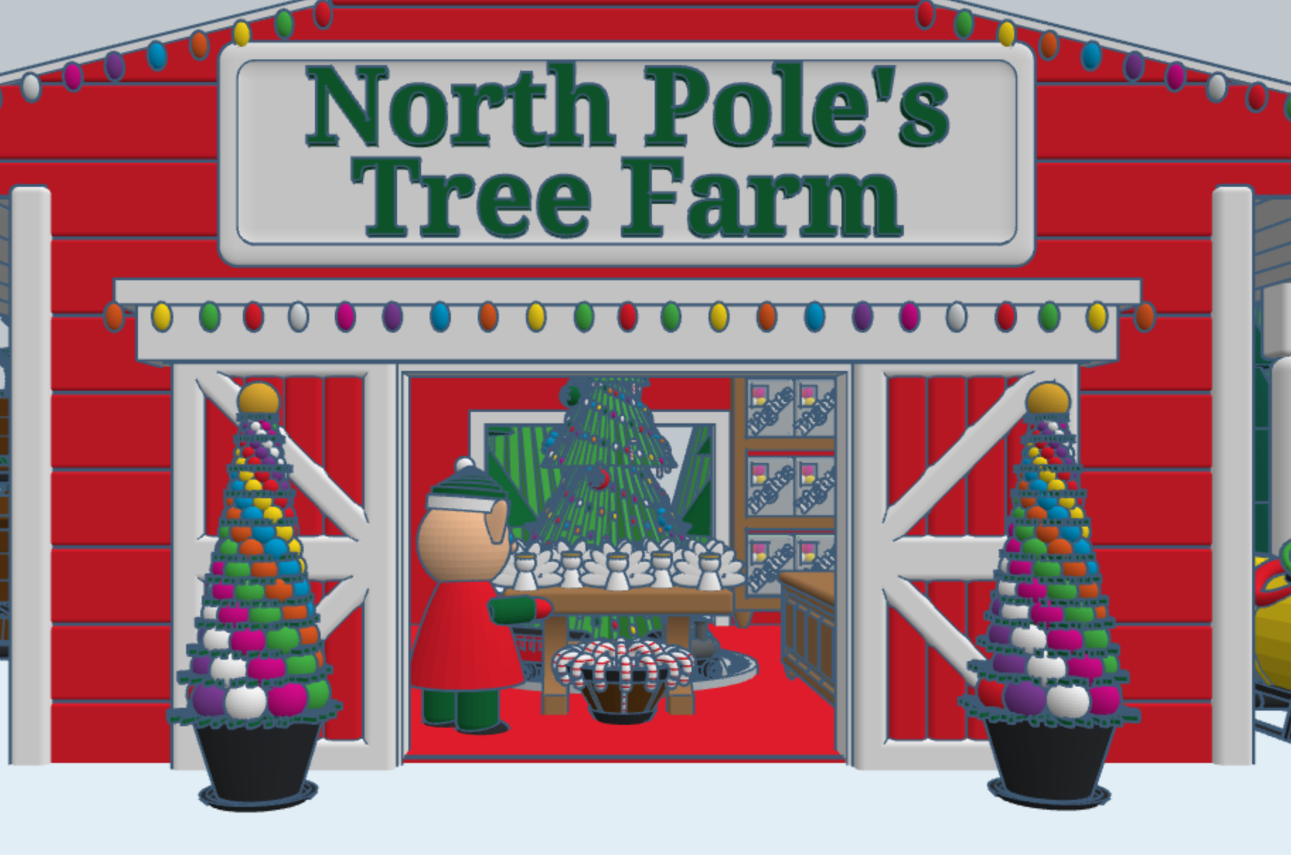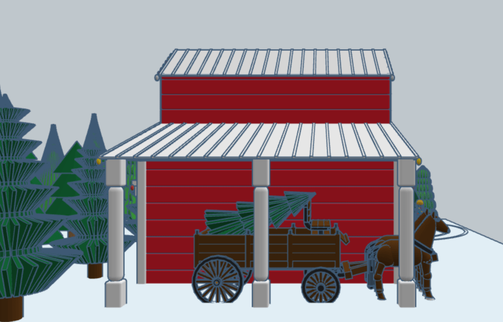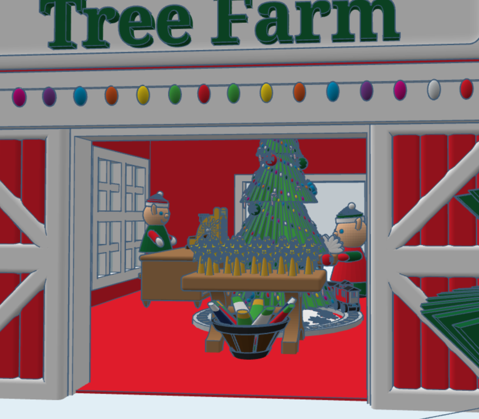 This year, for Christmas, I decided to design a North Pole Christmas Tree Farm in Tinkercad, with a barrel train to take visitors around the farm. I placed the shop inside the barn, I guess some of the reindeer gave up their lodging for the season. The shop sells tree decorations. You can copy this design and add your own objects to Tree Farms.
