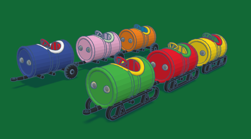 The barrel train was created in a different design. One train set has skids for use on snow, and another train set has wheels for use on the ground. You can copy the train, but you will have to design your own form of propulsion.
