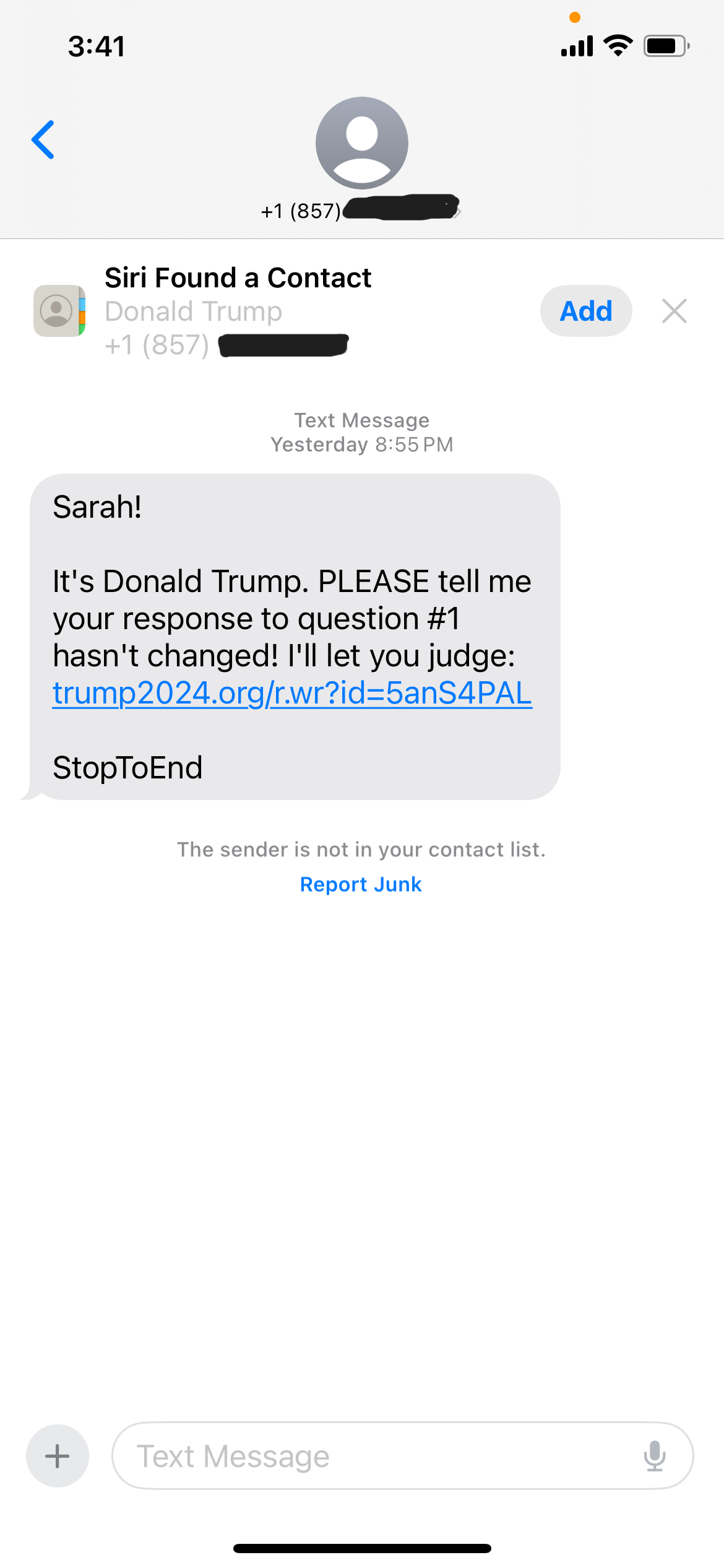 They made the text message look very legit, by referencing my name, including a Contact card for a “Donald Trump”. From media reports he lives in Florida, after moving there from New York. Why would he have a cellphone for a Massachusetts area code?