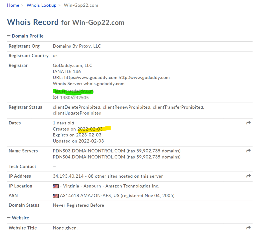 Red highlight: The domain’s registrant information was redacted for privacy. Why would a legitimate company or organization need privacy? Very suspicious.