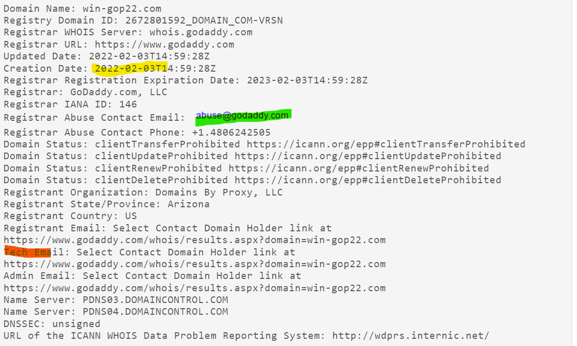 To check out domains, I use https://whois.domaintools.com/. Type the domain into the search box and press Search. Example: win-gop22.com. When I followed these steps for this domain, I found suspicious items: