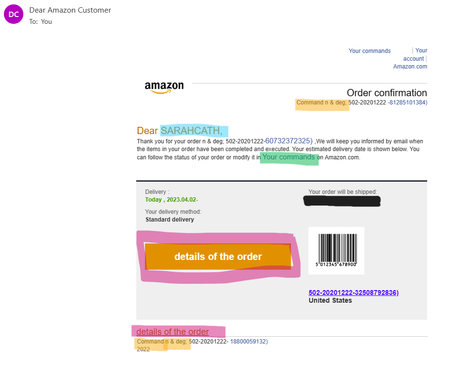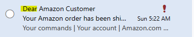 Do you see the problem with it? Okay, I did highlight it. Amazon never ever refers to anyone as “Dear”. They are always blunt and to the point. Also, that red exclamation mark is another indicator. I did open the email (shame on me) to see how many times the spammer announced they were a spammer.