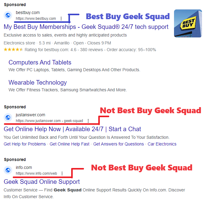 Sponsored Links: Google and Bing are proactive in shutting down scammers, but the scammers are creating fake webpages and are purchasing fake ads faster than these companies can shut them down. Yes, scammer buy ads just like legitimate companies. If I search for “Geek Squad” I will see Sponsored on Google and Ads on Bing. Both return several links that were not Best Buy’s Geek Squad. These non-geek squad links maybe legitimate companies, or they could be scammers.