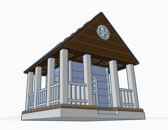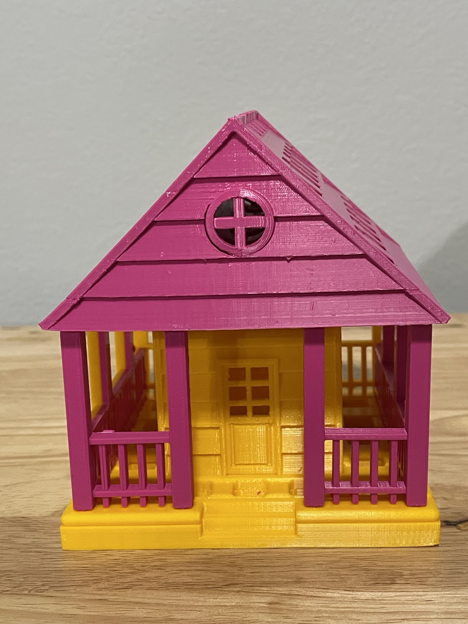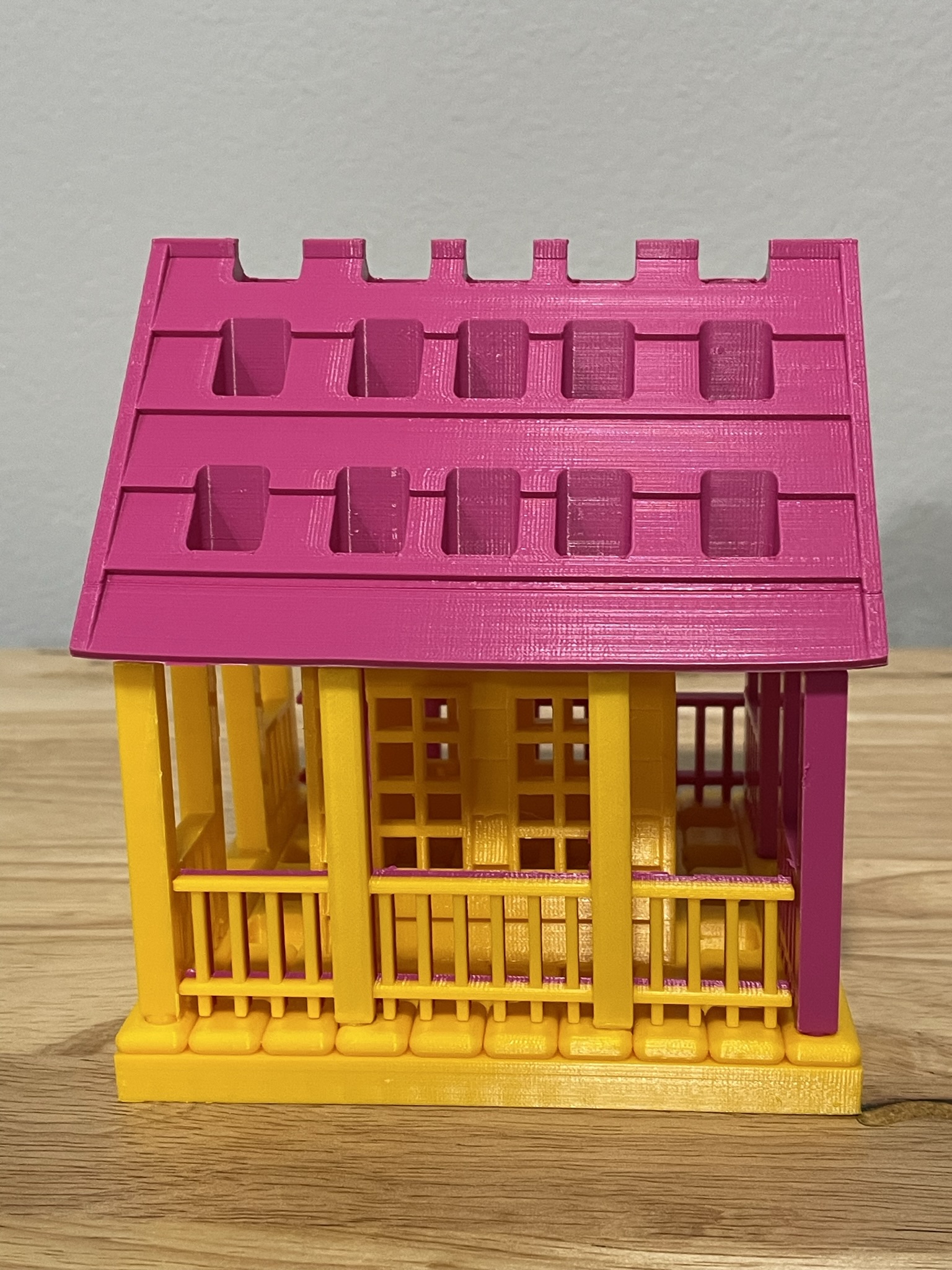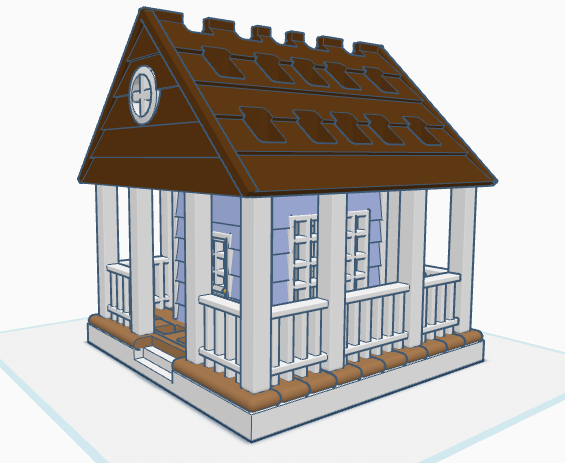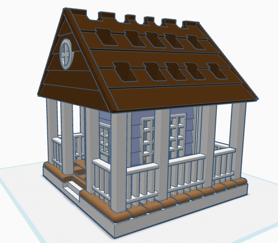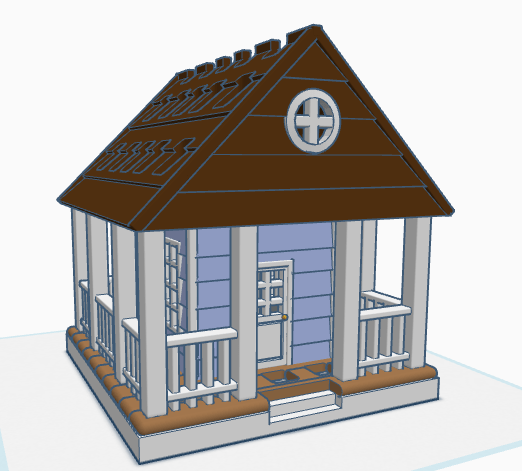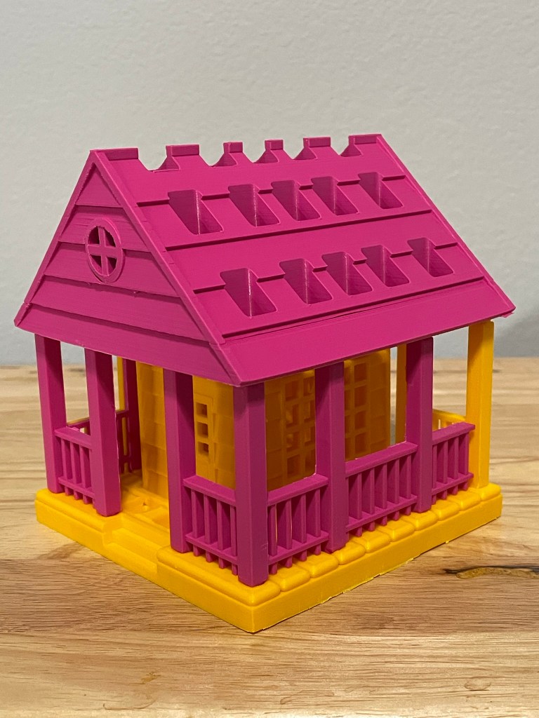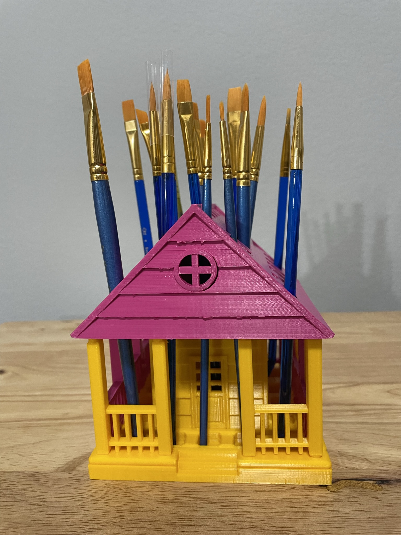 If you have seen some of my previous posts, you know that I paint little plaster houses. While I was painting a new set of houses, I decided it would be nice if I had a paintbrush holder. Yes, I could have purchased one on Amazon, but what is the fun in that. I decided to design a paintbrush holder that looked like a house. The size was not important as long as I could print the design on my 3D printer. The base is 120 mm or 4.724 inches x 120 mm x 8 mm. It provided the design with enough weight and support to prevent it from tipping over. This is the final version of the design in Tinkercad. It was tweaked several times for printing. Paintbrush Holder – Tinkercad