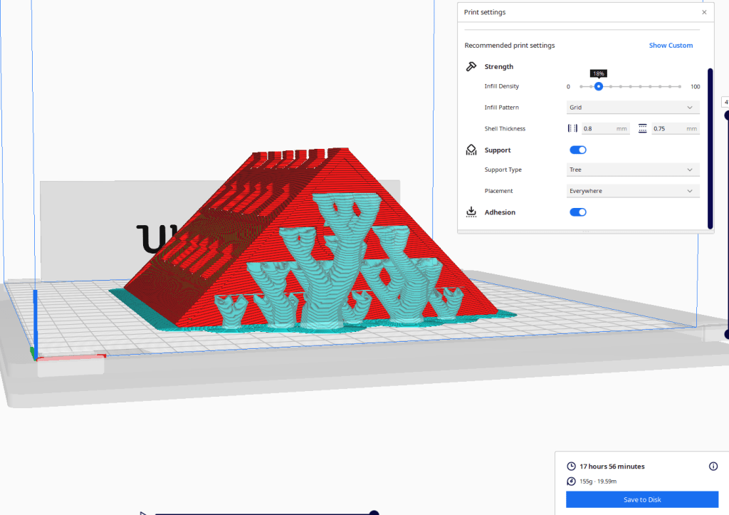 If I printed the design as shown in the picture, it would require a lot of support. My first attempt to print, I split the design into two pieces; roof and building. The roof I selected the Support Type of Tree. There is a lot that can go wrong with printing something for hours and hours, however the roof printed beautifully, and the supports detached easily.