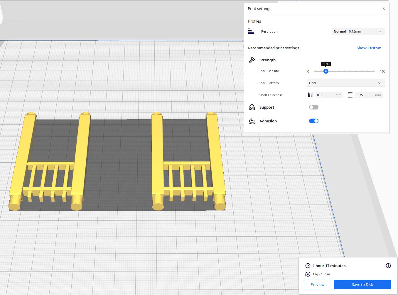 For the second attempt, I made the railing detachable. With detachable railing, I could lay it flat on the print bed and not use any supports. After it was printed, I could assemble the design.