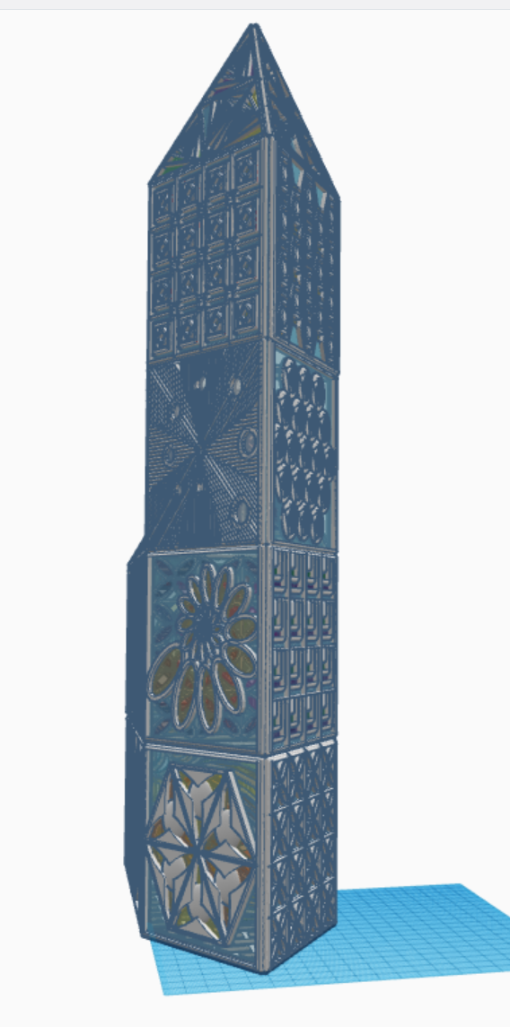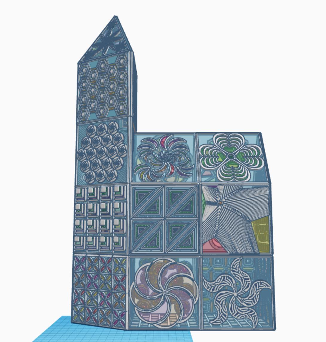 What can you create with these tiles? I created a Glass Tower in Tinkercad with the 31 tiles. The only tile I reused was the last tile, the bottom tile, the tile I used for the floor. Below are pictures of my Glass Tower. The 3D view is available at this link: Glass Tower